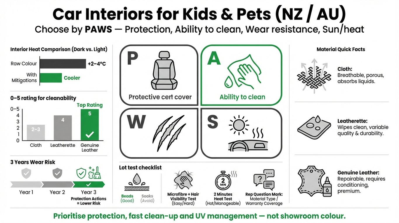 Practical NZ/Australia guide to picking interior colour, material and protection so kids, dogs and sand don’t wreck your cabin or resale value.