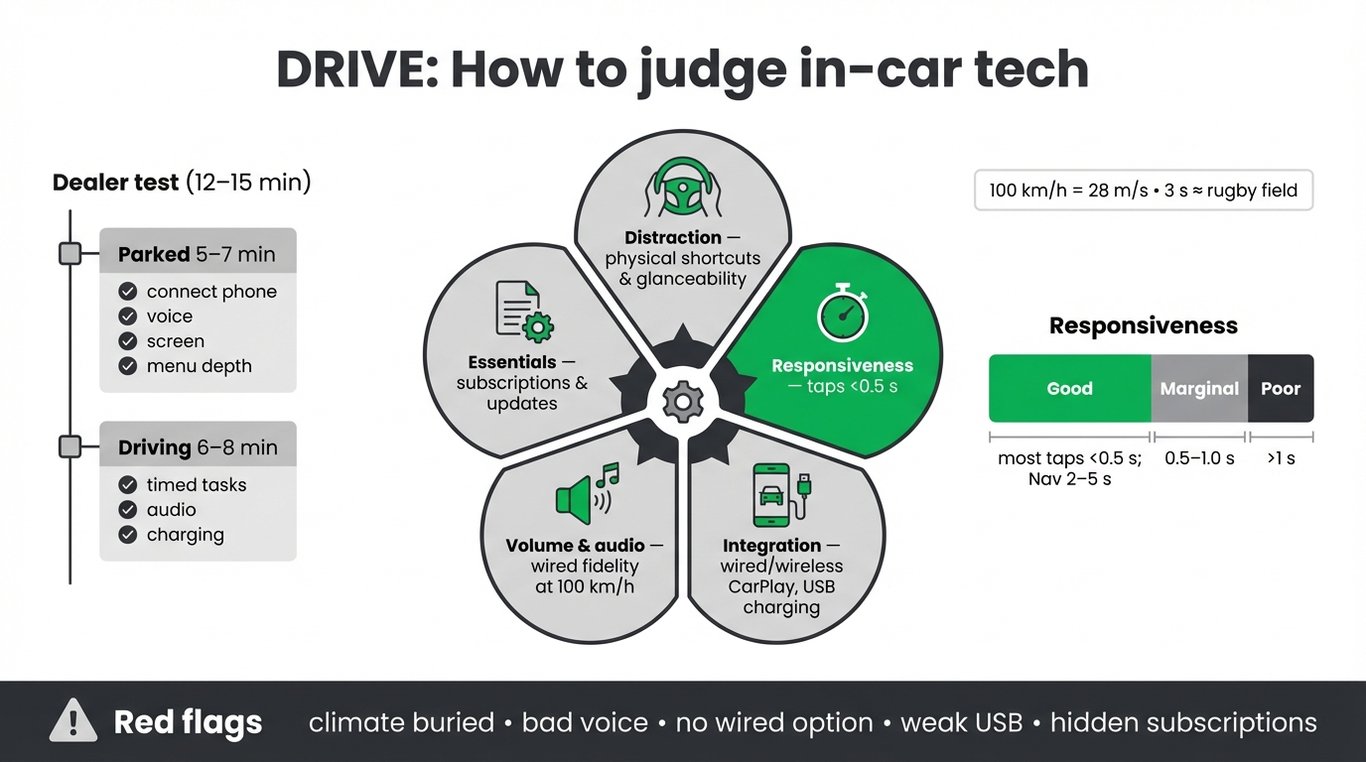How to test a car’s infotainment and cabin tech quickly - avoid lag, hidden controls and weak charging using the safety‑first DRIVE framework on your next test drive.