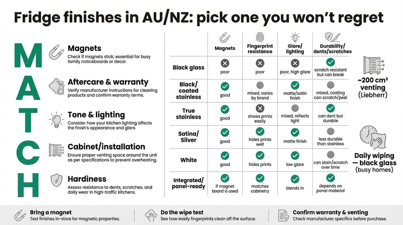 Avoid showroom regret. Learn how finishes - black glass, black stainless, Satina, integrated - affect cleaning, magnets, glare and installation in AU/NZ kitchens.