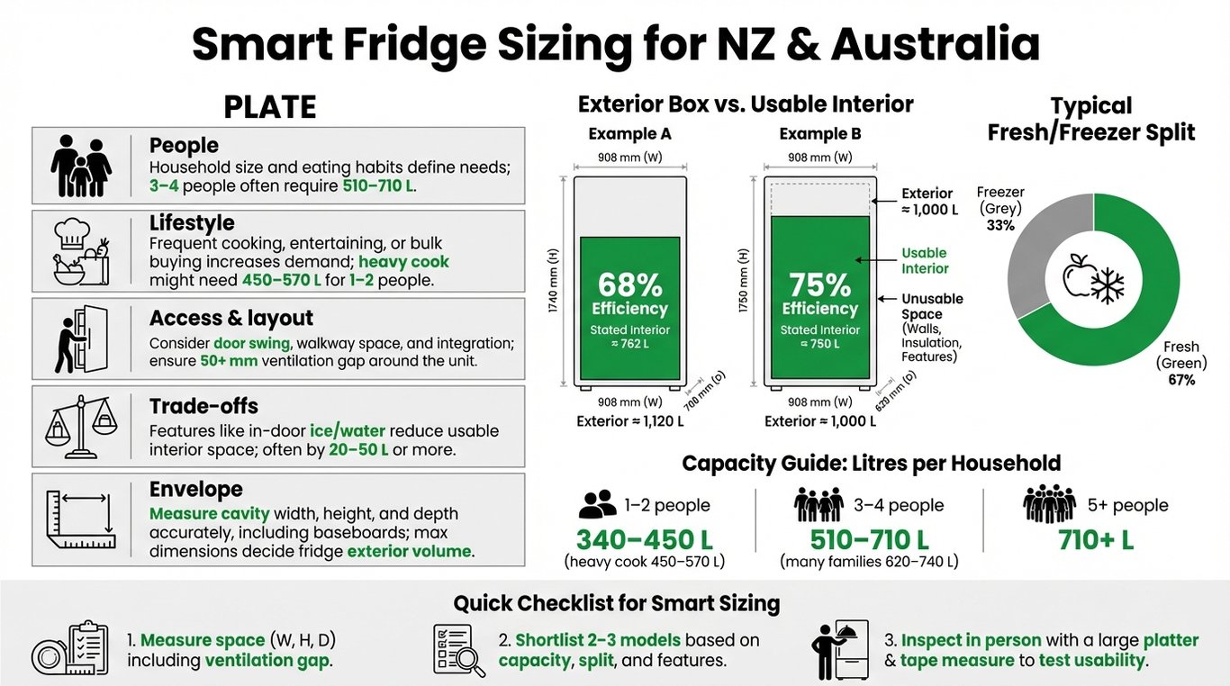 Learn why headline litres lie, how to measure usable fridge space, and use the PLATE framework to pick the right refrigerator for NZ and Australian homes.