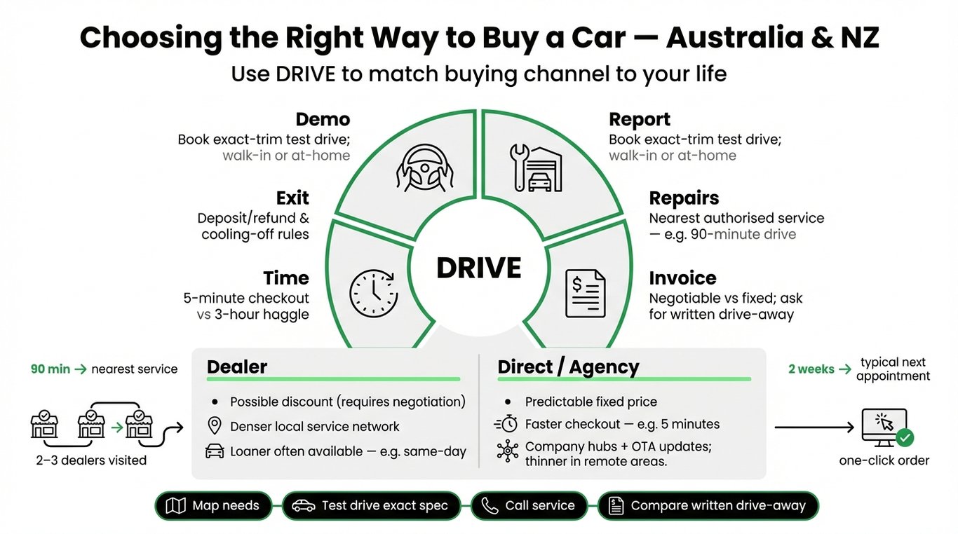Stop choosing on price alone - learn how dealer, direct or agency buying shapes price, service access and ownership in Australia & New Zealand.