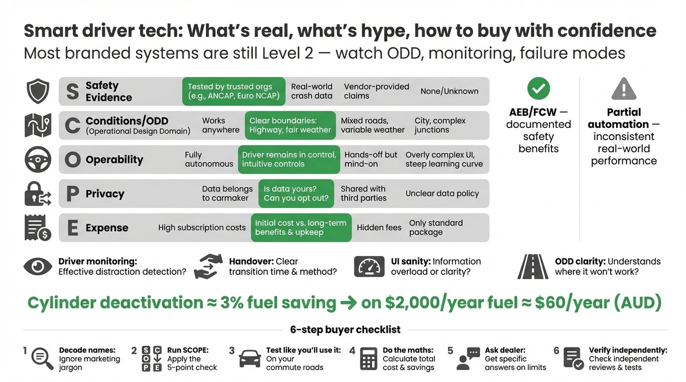 Cut through 'hands-free' marketing. Learn which driver-assist features actually improve safety and comfort in Australia & New Zealand, with a practical SCOPE buying checklist.
