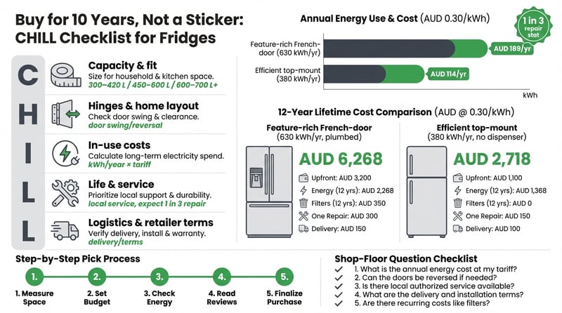 Look beyond sticker price: calculate 10–12 year fridge costs in Australia & New Zealand - energy, filters, repairs, delivery and smarter trade-offs.
